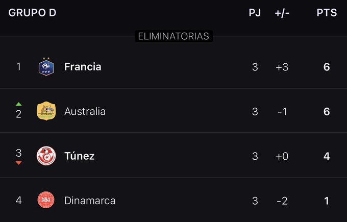 El equipo danés fracasó en su imperativa meta de doblegar a Australia, que se impuso por 1-0 y acabó con los mismos puntos que Francia. La razón: el DT de los galos, Didier Deschamps, envió suplentes para el cotejo con Túnez y perdió, también por 1-0.