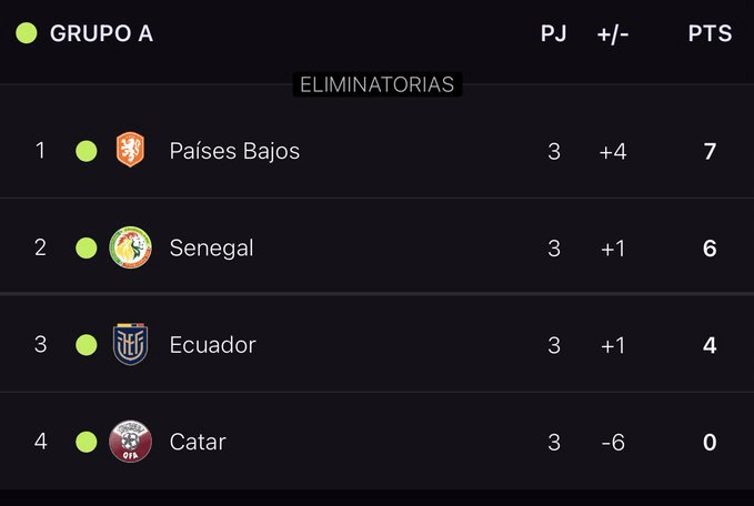 Países Bajos, que jugó los tres cotejos de su llave con una pereza incomprensible, ganó el grupo A tras un triunfo 2-0 sobre Qatar, que se convirtió en el peor seleccionado anfitrión de la historia: sin puntos y con apenas un gol anotado. De esta manera, no hubo sorpresas en la tabla final.