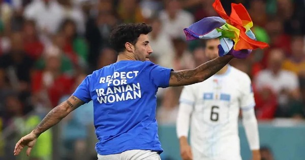 Finalmente, el activismo se había apagado un poco, pero hay gente que busca maneras de hacerse notar. En el minuto 6 del duelo entre Portugal y Uruguay, una persona ingresó a la cancha de estadio Icónico de Lusail con una bandera arcoíris y dos letreros en su ropa, uno alusivo a la guerra de Ucrania y otro a las protestas en Irán.