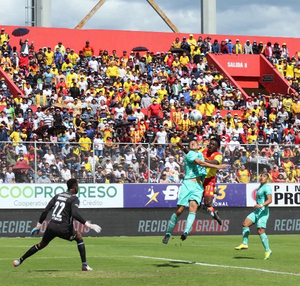 Alexander Domínguez (n. 22), mira el cabezazo de Roberto Ordóñez, para el gol de Aucas. Foto: @Aucas45 -Superclásico quiteño: el gol del último minuto